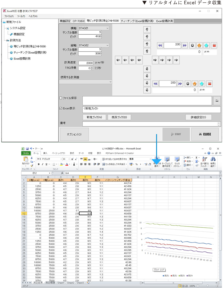 マトリクス(格子状)に測定、または、Excelに登録した座標毎に測定するかを選択。自動で移動しながらWI-5000からの測定データを取得し、リアルタイムに Excel にデータ収集できます。